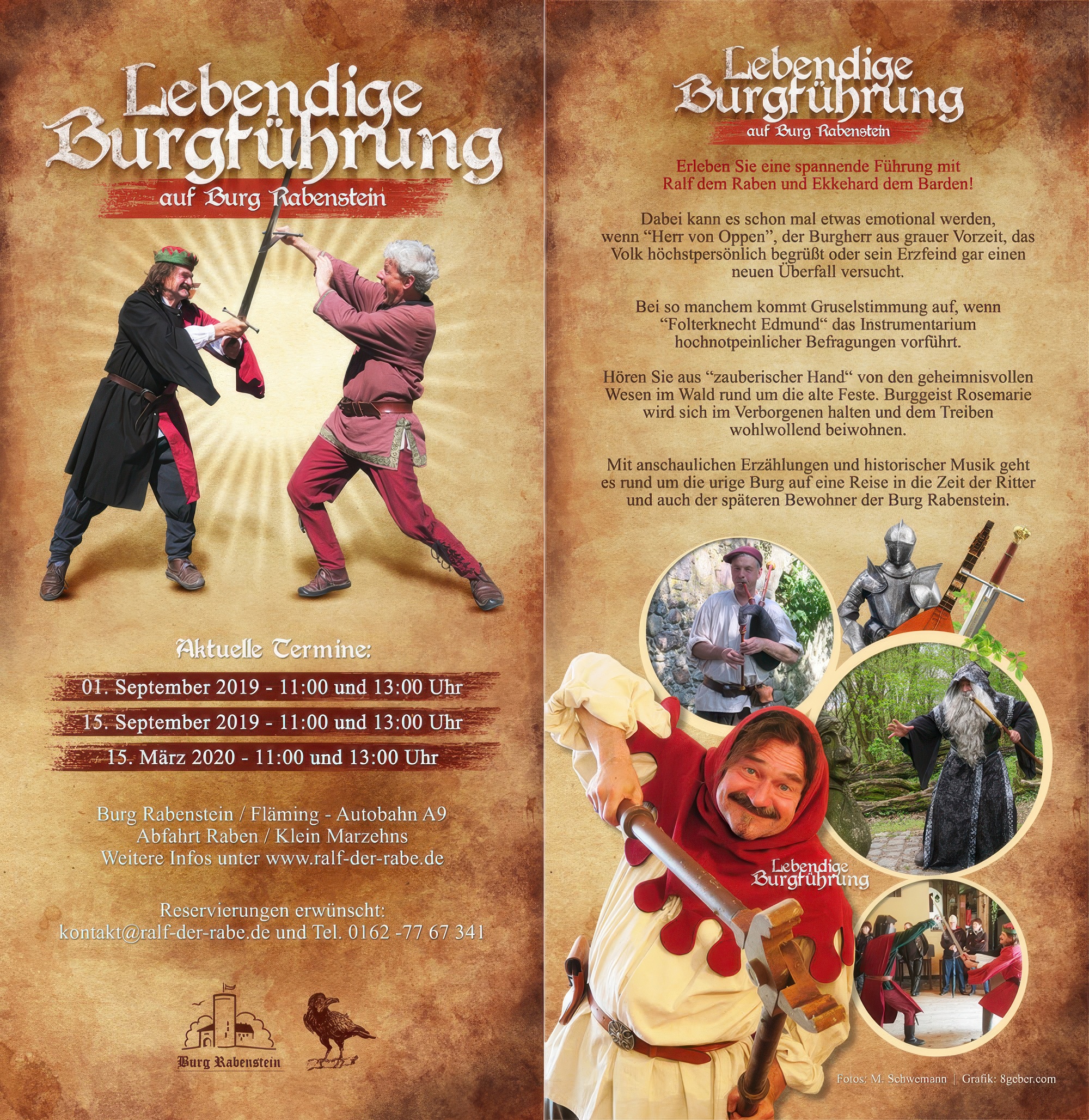 Dabei kann es schon mal etwas emotional werden, wenn „Herr von Oppen“, der Burgherr aus grauer Vorzeit, das Volk höchstpersönlich begrüßt oder sein Erzfeind gar einen neuen Überfall versucht. Bei so manchem kommt Gruselstimmung auf, wenn „Folterknecht Edmund“ das Instrumentarium hochnotpeinlicher Befragungen vorführt. Hören Sie aus „zauberischer Hand“ von den geheimnisvollen Wesen im Wald rund um die alte Feste. Burggeist Rosemarie wird sich im Verborgenen halten und dem Treiben wohlwollend beiwohnen.