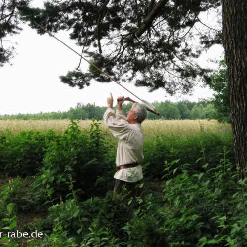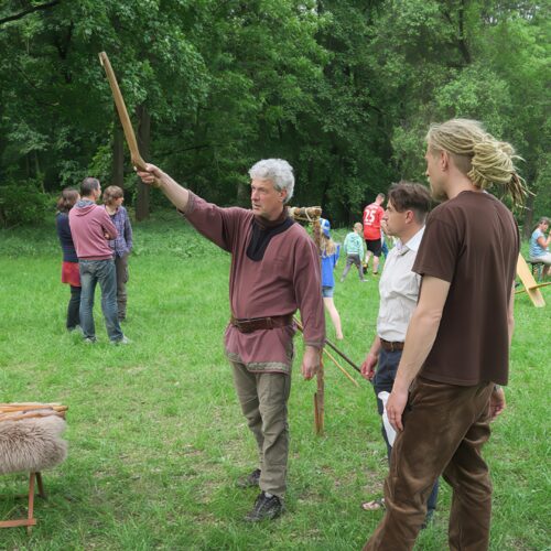 Zwischen den Aktivitäten lässt das „Handy der Steinzeit“, das Schwirrholz, auch das Gehör der Teilnehmer an der Zeitreise teilhaben.